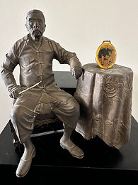 Seated Bronze Chinese Dignitary resting his arm on the table. Chinese bronze figuriines have a rich history and cultural significance. A photo of this dignitary appears on a bronze medallion which is included with the sculture. This particular medallion must have been the inspiration for the sculpture that pays tribute to Chinese culture.