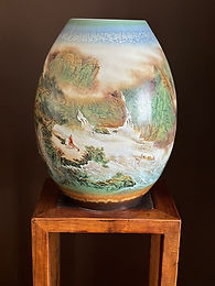 Chinese Hand Painted Vase - All Certificates & Artist Info Included - Very large hand painted vase showcasing the rich tradition of Chinese porcelain craftmanship. Meticulously decorated with an intricate design depicting a landscape of green trees, a forest, and waterfalls.